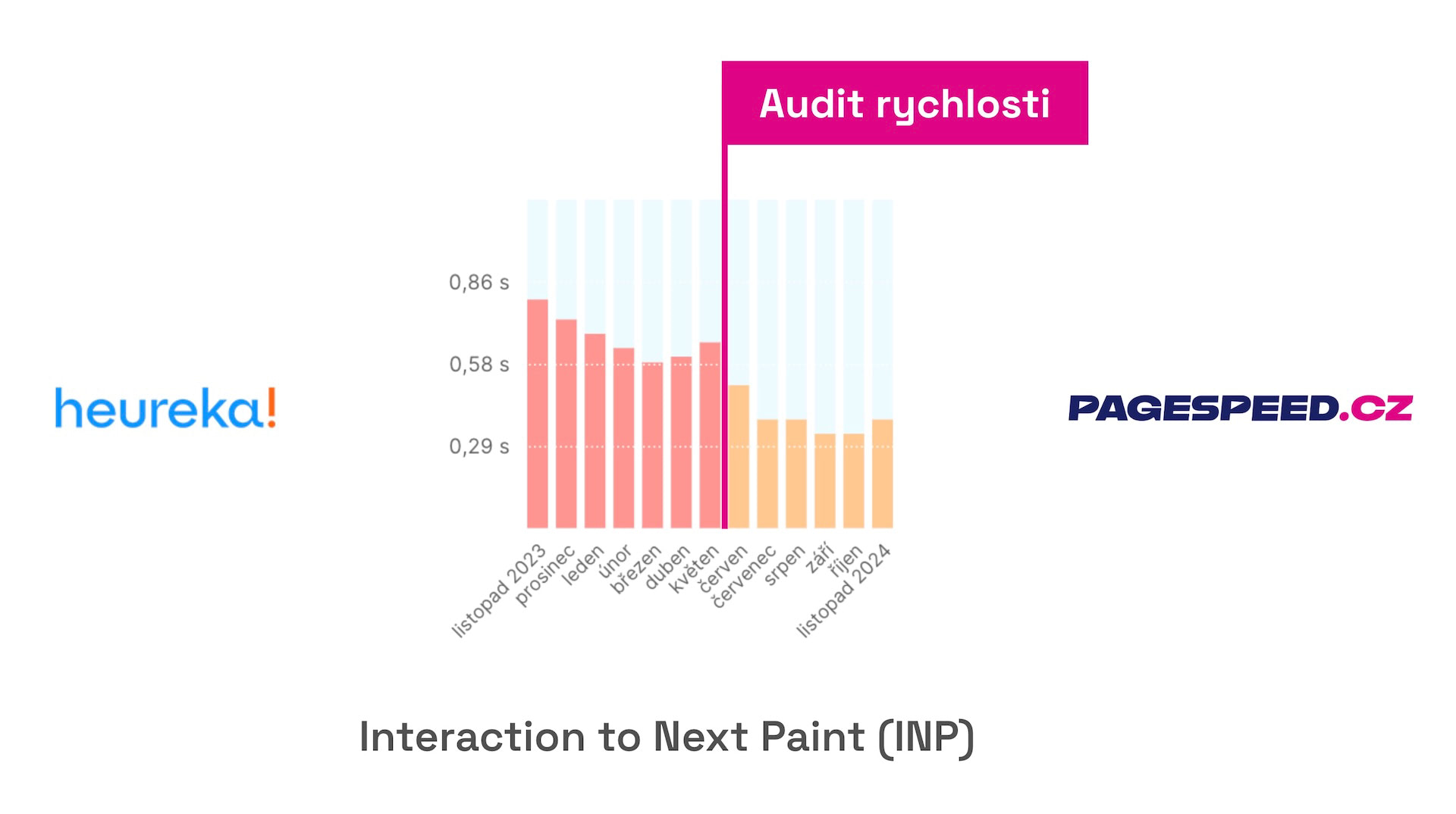 Příkladem může naše práce pro Heureka.cz, kde jsme se v auditu zaměřovali na metriku rychlosti odezvy na interakce (INP) a výsledkem bylo skokové zlepšení a stále trvající dlouhodobá spolupráce.