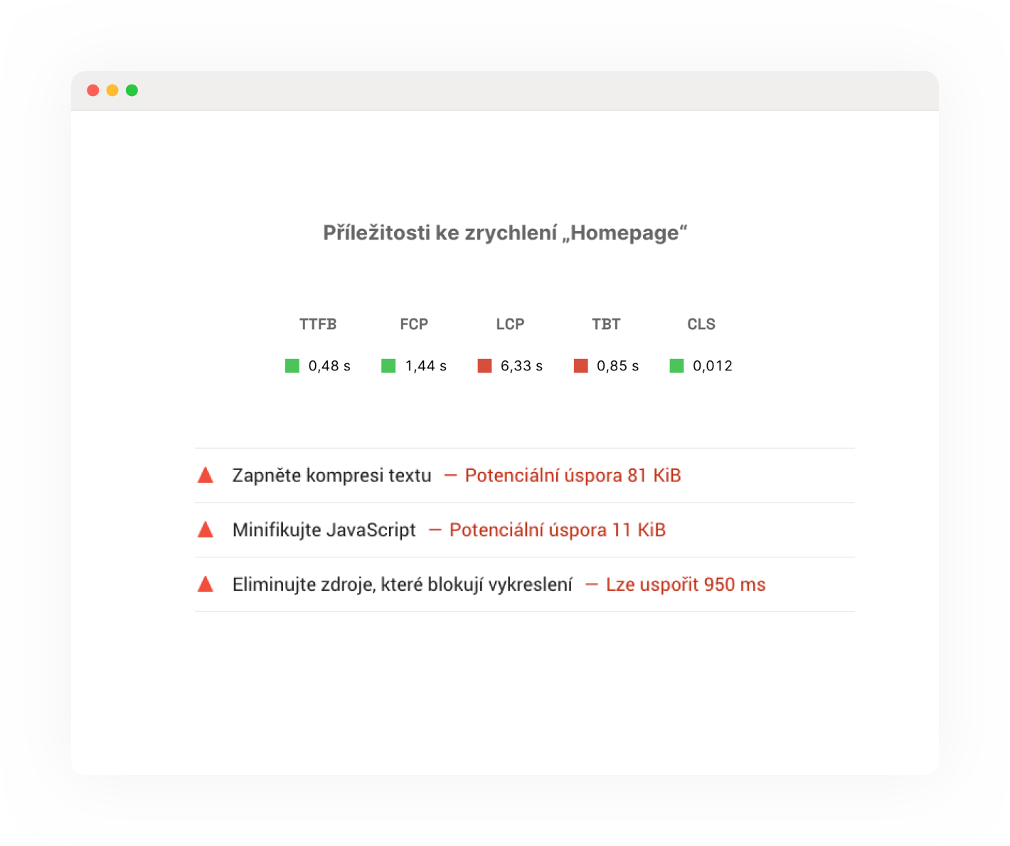 Detailní data z Lighthouse, poznámky v grafech vám pomohou optimalizovat web. Díky naší nápovědě se o  rychlosti webu dozvíte více.