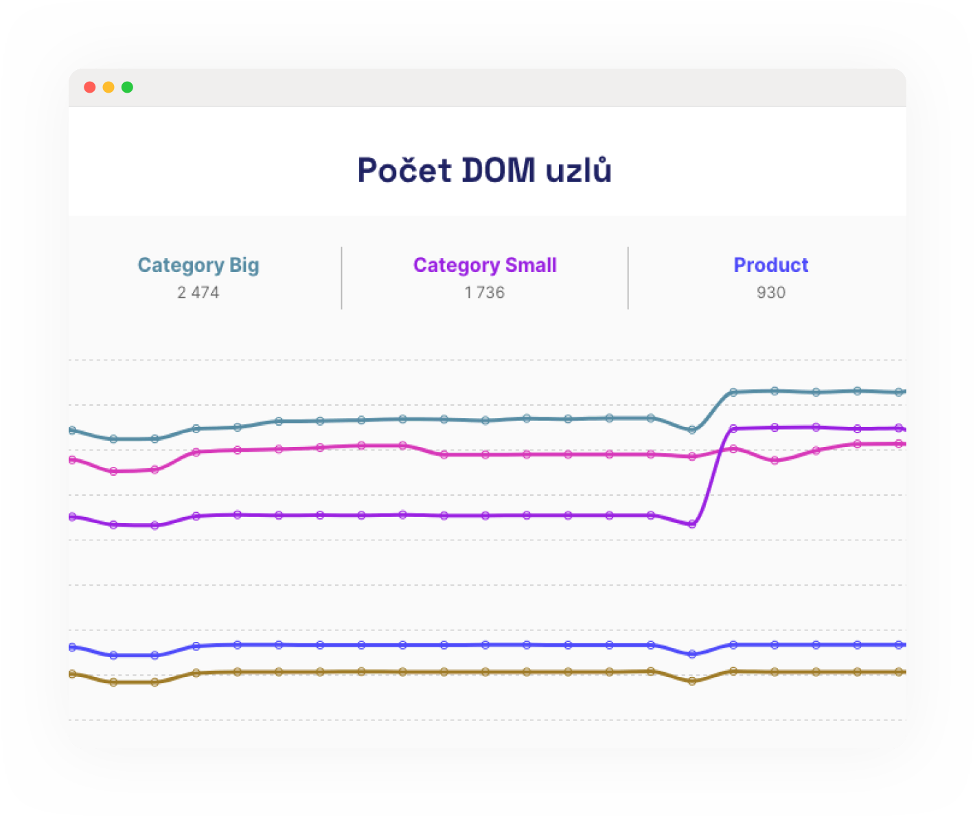 Report „Technické“ pomáhá identifikovat příčiny změn metrik. Sledujeme v něm vývoj datového objemu CSS, JS, obrázků, velikost DOMu a další technické ukazatele.